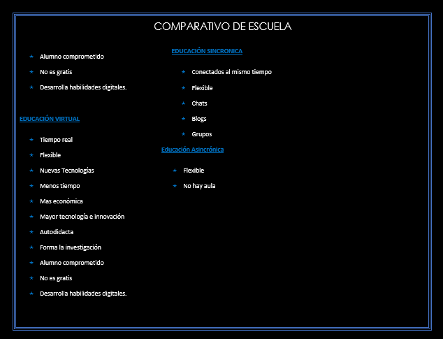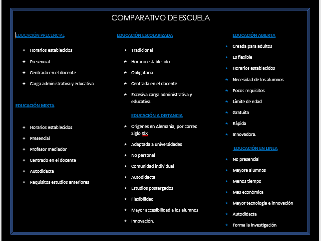 De acuerdo a las nuevas tecnologias se realiza un comparativo por escuela, en donde se desarrolla la evolución y las nuevas formas de educación, actualmente la educación se apoya del uso de las TIC.